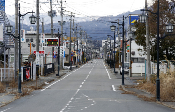 후쿠시마 핵발전소 사고 이후 사람들이 떠나 텅 비어 있는 나미에마치 거리의 모습.