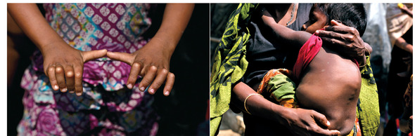 방글라데시 미등록 로힝야 캠프에 사는 한 어린이가 굽은 손가락을 보이고 있다. 흔한 설사병에서부터 이 아이처럼 원인을 잘 알 수 없는 질병과 증세까지 구호활동이 제한된 캠프 난민들의 건강 상태는 열악했다(왼쪽). 같은 캠프에 사는 4살 소년 소메야딴은 꼽추로 태어나 사고까지 만난 뒤 늘 숨을 가쁘게 몰아쉰다. NGO가 운영하는 캠프 내 병원에서 기본적인 의료 지원만 가능할 뿐 질병 ‘치료’ 같은 건 꿈도 못 꾼다.