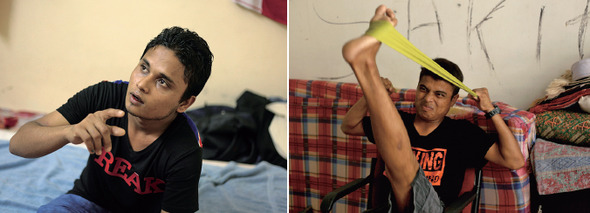 로힝야 보트난민 무하마드 살림(20)은 2012년 9월 아라칸주 시트웨에서 출발했다. 살림은 나사카, 경찰, 룬틴 등 보안군들이 로힝야들의 밀항선 마련을 적극 도왔다고 말한다. 방글라데시 영토인 생마린섬을 거치지 않고 말레이시아로 직행하려던 살림의 배는 타이 국기가 펄럭이는 배의 안내로 타이 해안가로 들어왔다. 살림의 사례는 타이 당국이 로힝야 난민을 ‘본국 추방’인 양 가장해 또 다른 타이 인신매매단에 팔았음을 보여준다(왼쪽). 로힝야 보트난민 무하마드 라피크(18)가 고무줄 등을 이용해 자가 재활 치료를 하고 있다. 라피크는 자신이 탄 배가 타이 해안에 가까워질 무렵 단속 경찰과 브로커 간에 총격전이 있었다고 말했다. 2012년 12월 이후 로힝야에 대한 집단괴롭힘이 급증했다고 말한다.
