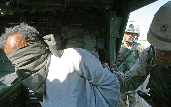 2003년 4월, 미군이 이라크 바그다드를 점령한 뒤 사담 후세인 친위조직 ‘페다인 사담’ 등의 저항이 이어졌다. 미군 병사들이 사담 후세인의 고향 티크리트에서 페다인 사담의 일원으로 의심되는 사람을 체포해 장갑차에 태우고 있다. AP