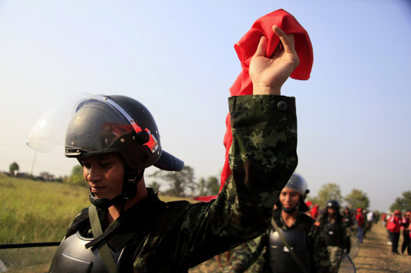 2010년 레드셔츠 진압에 나섰다가 시위대와 협상 뒤 현장에서 빠지던 한 병사가 빨간 수건을 들어 보이고 있다. 타이군의 사병 다수가 레드 성향이 강한 빈곤층이거나 동북부 지역 이산 출신이고 이들은 ‘수박병사’로 불린다. 이유경