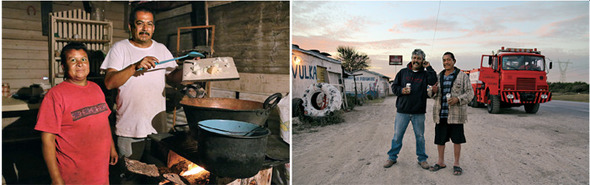 미니슈퍼 주인 내외가 판트란스 직원들을 위해 저녁 식사를 준비하고 있다. 새끼 양 한 마리를 삶아서 솥째로 내오고, ‘아로스’라고 부르는 쌀밥, 우리나라 팥죽과 맛이 흡사한 삶은 콩 요리인 ‘후리홀’, 옥수수 가루로 부친 빈대떡인 ‘토르티야’, 염소 젖으로 만든 치즈 등을 뚝딱 만들어 테이블 위에 차려놓았다(왼쪽). 갱단이 장악한 멕시코 동부의 타마울리파스 지역에서 야간에 움직이는 건 아주 위험한 일이다. 어둠이 깔리기 시작할 무렵 홍 사장의 트레일러 트럭이 하룻밤을 나기 위해 시우다드빅토리아 인근의 외딴 도로변 미니슈퍼 앞에 차를 세우자 주민이 나와 반기고 있다.박상주