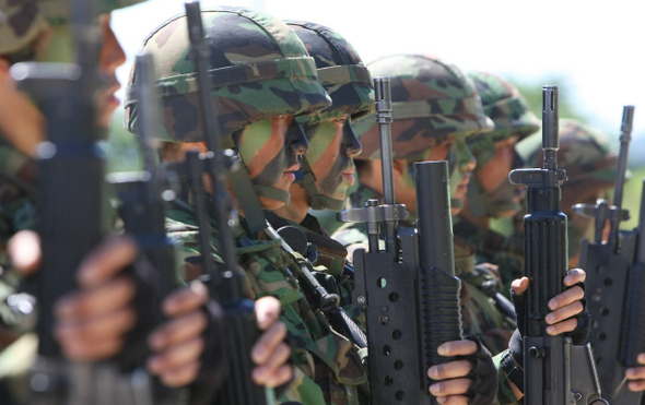 제6보병사단 수색대원들이 23일 오후 강원도 철원군 동송읍 월정리역 근처 비무장지대에서 수색정찰을 하기 앞서 신고를 하고 있다. 철원/이종근 기자 root2@hani.co.kr