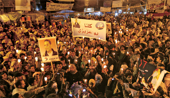 2011년 12월17일 ‘아랍의 봄’의 불을 댕긴 튀니지 노점상 모하메드 부아지지의 분신 1주기를 맞아, 예멘 사나에서 그의 죽음을 기리는 촛불집회가 열렸다. AP