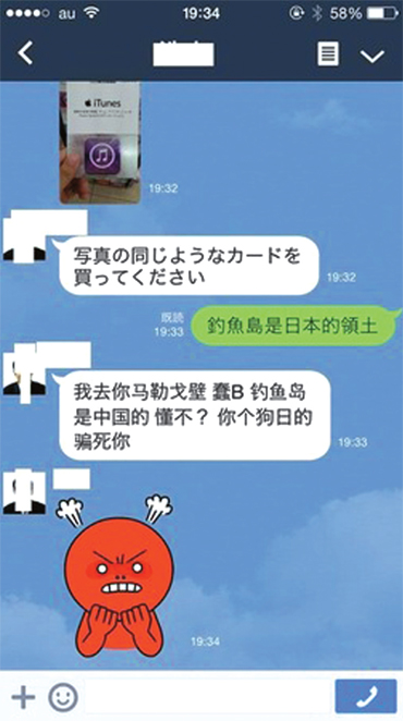 사기꾼도 애국심에 버럭한다. “센카쿠제도는 일본 땅”이라고 중국어로 답을 하니 상대방이 화난 스탬프를 보내왔다. 인터넷 화면 캡처