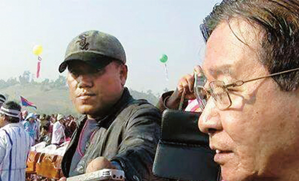 군부대 구금 중 살해된 기자 아웅나잉(왼쪽)이 취재하는 모습. 휴전협상 정부팀 대표인 아웅민 장관을 인터뷰하고 있다. 군은 그가 카렌반군 중 하나인 민주카렌불교도군(DKBA) 소속이라고 주장한다. 아웅나잉 페이스북 비디오 화면 갈무리