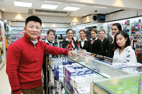 파라과이 동쪽 끝 국경도시인 시우다드델에스테에서 미용제품 전문 쇼핑센터인 ‘테라노바’를 운영하는 명세봉 사장이 매장에서 직원들과 함께 활짝 웃고 있다. 박상주 제공
