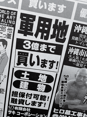 그런데 오키나와를 갈 때마다 반드시 사보는 <류큐신포>나 <오키나와타임스>를 읽다보면 기묘한 광고가 눈에 들어온다. 거의 하루도 빼놓지 않고 ‘군용지를 삽니다!’라는 단신 광고가 신문의 하단을 뒤덮고 있는 것이다. 군용지를 거래하다니! 처음에는 영문을 몰라 하다가 이런저런 자료를 읽다보니 형체가 잡히기 시작한다. 간단하게 말하자면, 미군이 점유한 미군기지 토지가 재테크 수단으로 ‘합법적’으로 거래되는 것이다.