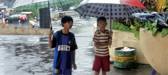 우산을 씌워주고 돈을 받는 자카르타 소년들. 비 오는 날엔 학교를 마치자마자, 혹은 학교를 빼먹고 일을 시작한다. 유현산
