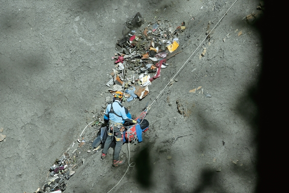 프랑스 구조대원들이 알프스 산악지대에 흩어진 저먼윙스 여객기 파편을 조사하고 있다. REUTERS