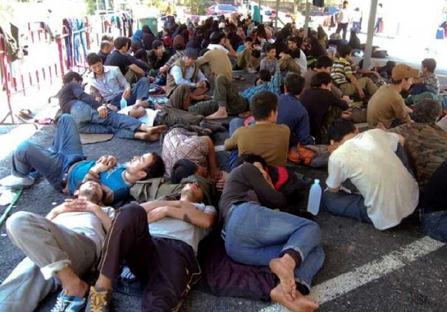2014년 3월 다양한 국경에서 잡혀온 위구르인들이 타이의 한 이민성에 모여 있다. 지난 5년간 동남아시아의 국경을 거쳐 탈출하는 위구르족이 늘고 있다. 출처 불명