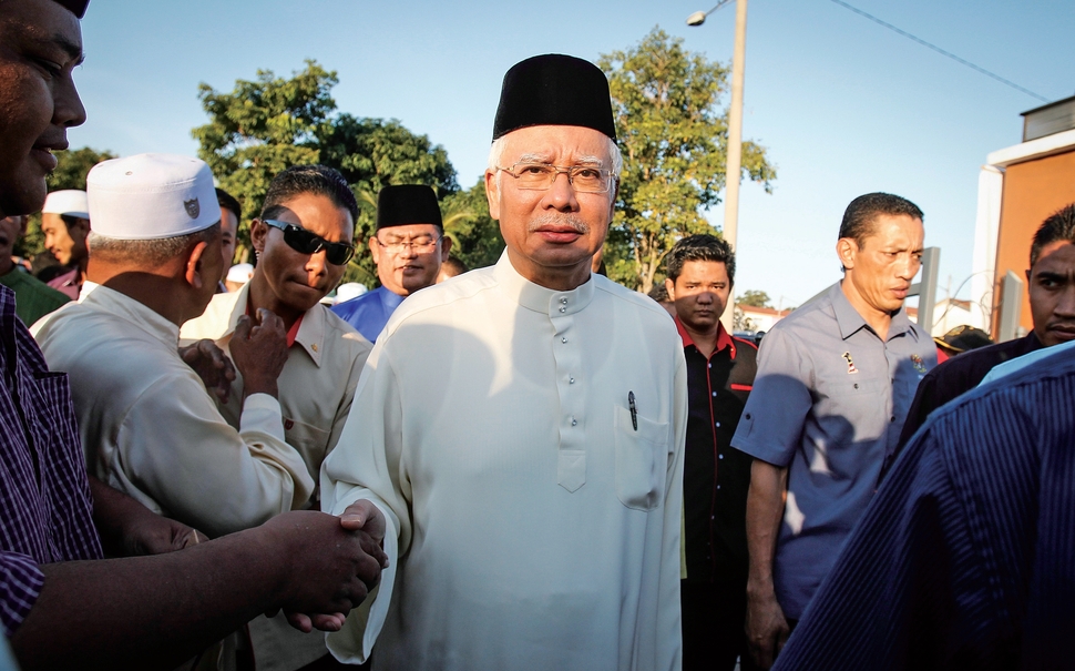 말레이시아 나집 라작 총리가 설립 때부터 고문위원장으로 활동한 1MDB의 시한폭탄이 터지고 말았다. 나집 총리가 쿠알라룸푸르에 있는 모스크에서 사람들과 악수를 나누고 있다. AP 연합뉴스