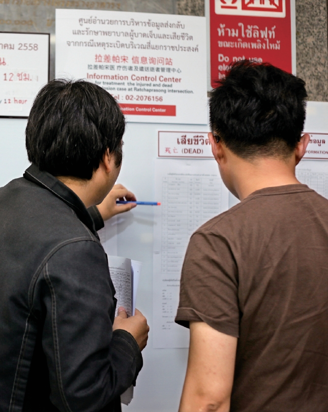 경찰 병원에서 중국 언론인들이 방콕시 공무원들의 도움을 받아 희생자 명단을 확인하고 있다. 이번 폭탄 사고는 20명 이상의 사망자 가운데 적어도 7명은 중국인이다.