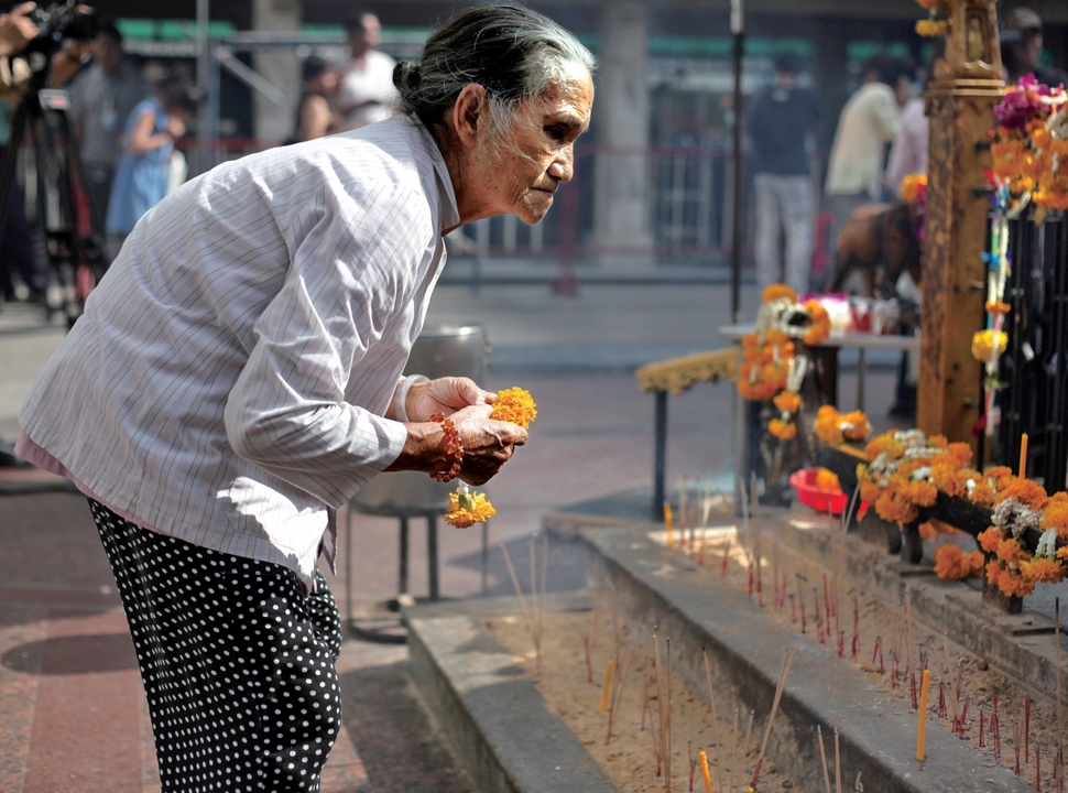 8월17일 방콕 중심가 라차프라송 구역의 에라완 사원에서 터진 폭탄은 20여 명의 인명을 앗아가고 120명 이상의 부상자를 낳았다. 중국계 버마(미얀마)인 지궈리안이 에라완 사원에서 기도와 헌화를 하고 있다