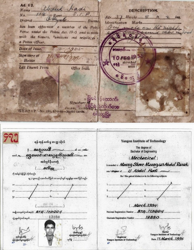 로힝야 국회의원 우 쉐마웅은 출생 당시 부모가 시민권자가 아니었다는 이유로 이번 총선 출마 자격을 얻지 못했다. 1965년 아버지가 경찰관으로 근무 중이었음을 증명하는 경찰증을 아라칸주 선거관리위원회에 보여주었지만 이의신청은 기각당했다. 아래는 우 쉐마웅의 랑군공대 졸업증. 우 쉐마웅 페이스북