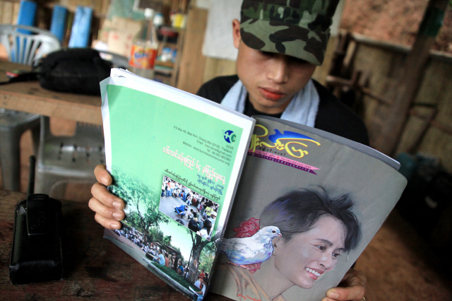 2009년 버마-타이 국경 반군 지역에서 카렌 병사가 아웅산 수치를 표지 모델로 한 시사잡지를 읽고 있다. 군사독재 시절 아웅산 수치는 버만족, 소수민족 할 것 없이 모두의 지지를 받았다. 버마가 개방 노선을 걸어온 지난 4년간 그는 독선적 리더십을 보이며 소수민족 문제에 침묵해왔다. 이유경