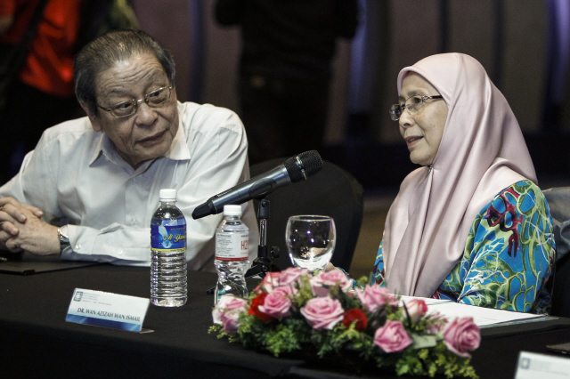 9월22일 신야권연대인 ‘희망연대’ 소속 정치인들이 기자회견을 하고 있다. 오른쪽이 수감 중인 안와르 이브라힘의 부인이자 인민정의당(PKR) 대표인 완 아지자. AP 연합뉴스
