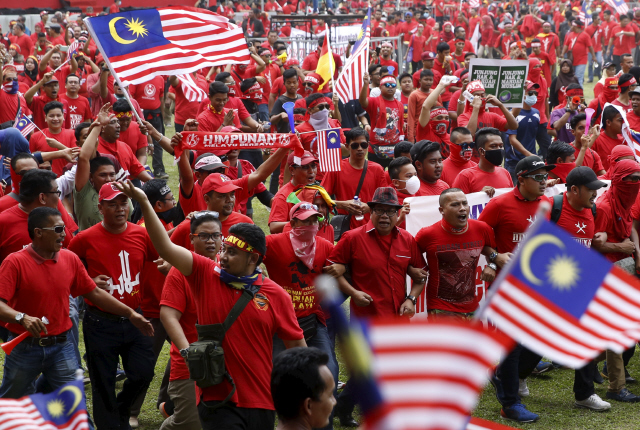 9월16일 ‘말레이 존엄’을 내걸고 연 레드셔츠 집회. 한 참가자는 취재진을 향해 “미친 중국 돼지”라는 막말도 서슴지 않았다. REUTERS