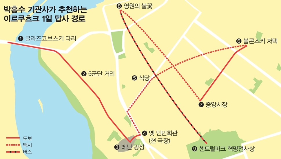 이날의 마지막 목적지로 가기 위해 버스 정류장으로 갔다. 이르쿠츠크 센트럴파크, 혁명전사상이 있는 곳이다. 버스 정류장에서 스마트폰에 번역된 러시아어와 지도를 보여주며 길을 물어 겨우 버스번호를 알았다. 지면의 뜨거운 열기를 받고 있는 발바닥에서는 불이 나고 있었다. 시원한 바닷물이 있다면 당장에라도 뛰어들었을 것이다. 이때 해운대행 버스가 정류장에 나타났다. 러시아 곳곳에서는 한국에서 수입한 중고버스들이 한글 행선지를 붙인 채 달리고 있다. 이르쿠츠크에서 해운대까지는 얼마나 걸릴까? 키릴문자와 한글이 뒤섞인 버스를 보고 이르쿠츠크와 한반도의 길고도 끈질긴 인연을 실감했다. 우리가 탄 버스는 작은 승합버스였다. 이르쿠츠크의 대중교통은 12루블, 300원도 안 되는 가격이다. 빵, 전기료와 함께 러시아의 3대 저가 품목이다.