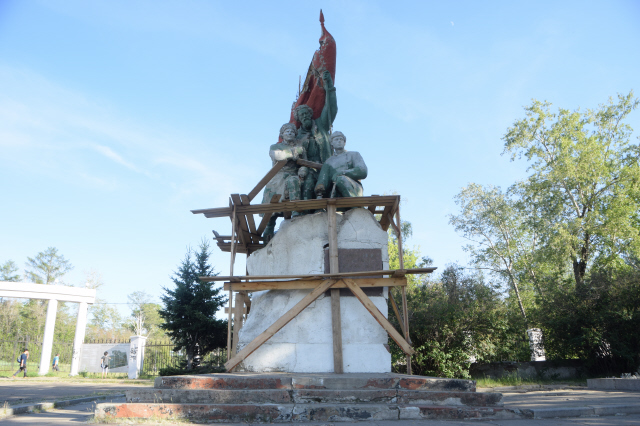 이르쿠츠크의 센트럴파크는 머릿속의 상상과 달랐다. 뉴욕 센트럴파크나 서울숲과 같은 모습을 생각했는데 관리되지 않은 숲이 우거진 동산이었다. 지도를 들고 숲길을 헤맨 끝에 혁명전사상을 찾았다. 혁명전사상은 이르쿠츠크 시내가 한눈에 내려다보이는 언덕에 서 있었다. 혁명을 우러르던 시절 상징적인 장소를 찾아 상을 세웠을 것이다. 그러나 러시아혁명은 내장을 발라내고 박제된 지 오래다. 아무도 돌보지 않은 돌상은 곳곳에 균열을 드러낸 채 삭아가고 있었다. 보수공사를 시작했다가 손을 놓았는지 낡은 목재 보강 틀이 혁명전사를 겨우 부축하고 있었다. 인간 해방을 믿고 총을 들었던 전사들은 그렇게 화석이 되어가고 있었다.