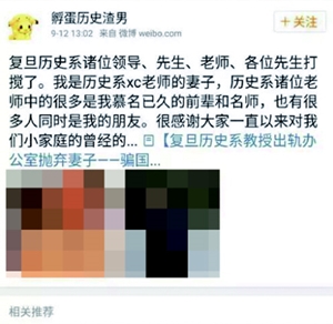 이에 앞선 지난 9월12일, 상하이의 명문대학 푸단대학교 인터넷 게시판에 장문의 글이 하나 올라왔다. “푸단대학교 역사학과에 재직 중인 교수님들과 지도자 여러분, 저는 역사학과 교수 ××의 아내입니다”로 시작하는 이 글은 충격적 폭로를 담아 푸단대뿐만 아니라 전국적으로 일대 반향을 몰고 왔다.