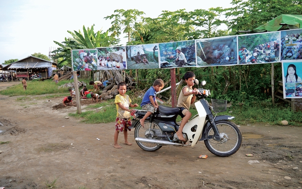 버마 이라와디강 둔덕에 있는 미치나 난민촌 공터에 내전 과정에서 희생된 난민들의 사진이 내걸려 있다. 김경미