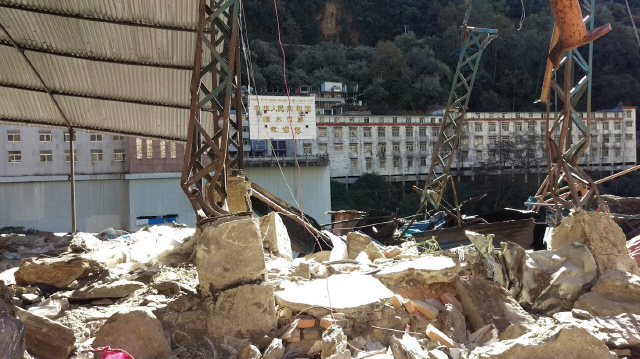 네팔과 중국의 국경 인근 도시 타토파니. 지진과 산사태로 무너진 주유소 건물과 보테코시강 너머로 보이는 중국의 백화점. 중국은 2015년 네팔 지진과 산사태 이후 안전을 이유로 국경무역을 무기한 중단했다.
