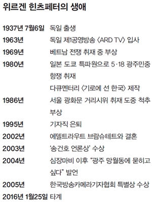 독일 제1공영방송 소속 카메라 기자였던 그는 계엄군의 삼엄한 경계를 뚫고 광주민중항쟁 현장에 들어가 시민들이 무참하게 학살당한 모습을 카메라에 기록으로 남겼다. 한국 언론이 거짓을 말하는 순간, 그의 눈과 카메라에 담긴 영상이 ‘광주의 진실’을 오롯이 증언했다. 1980년 9월 김대중 전 대통령에게 사형이 선고된 뒤 힌츠페터가 제작한 45분짜리 다큐멘터리 <기로에 선 한국>은 1980년대 대학가 등에서 비밀리에 상영되면서 민주화운동의 불길을 댕겼다. 힌츠페터는 2004년 심장마비로 쓰러졌을 때 “광주 망월동 묘지에 묻히고 싶다”고 말할 정도로 한국을 제2의 고향으로 여겨왔다.