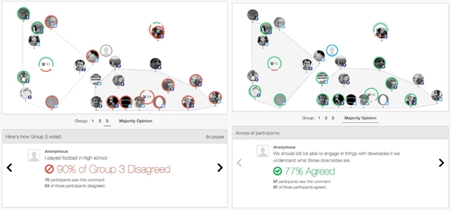 보통 수백 명이 온라인 공간에서 한 주제에 대해 이야기하더라도 저마다 말하는 포인트가 다르다. 결국 그 이야기는 합의를 끌어내기 위한 토론이 아니라 각자가 자기 이야기를 하게 될 뿐이다. 그 이야기들마저 어딘가로 수렴되지 않고 흩어진다. 대화들 속에서 합의점은 무엇인지, 이견은 무엇인지를 정확하게 찾아내면 잡음은 줄어들고 효용성은 증가한다. 이런 대화를 토대로 사람들 간의 작용도 긍정적으로 바뀐다.
