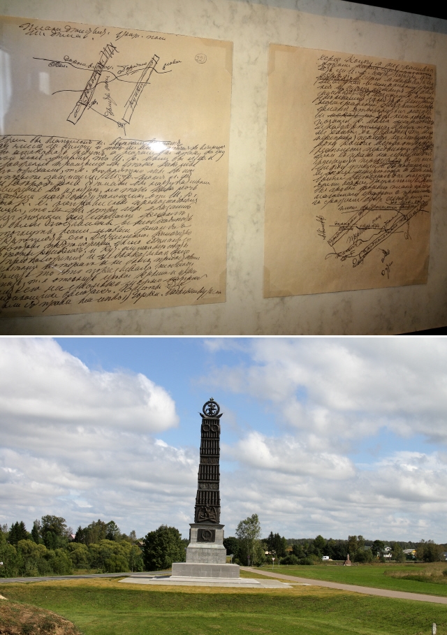 톨스토이의 친필 원고(위쪽)와 러시아 전승 기념비. 톨스토이가 <전쟁과 평화>에서 갈파한 역사의식은 민중사관과 닮았다. 임헌영