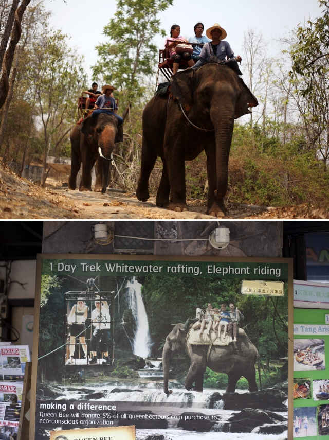 타이 치앙마이 동물원의 코끼리가 관광객을 태우고 트레킹하는 모습. 어린 야생 코끼리를 길들이기 위해 좁은 우리에 가두고 날카로운 도구로 육체적 해를 가하는 ‘파잔’ 의식은 코끼리에게 외상후스트레스장애(PTSD)를 포함한 심각한 후유증을 남긴다(위쪽). 치앙마이 등 타이 전역에서 흔히 볼 수 있는 코끼리 트레킹 홍보 사진(아래쪽).