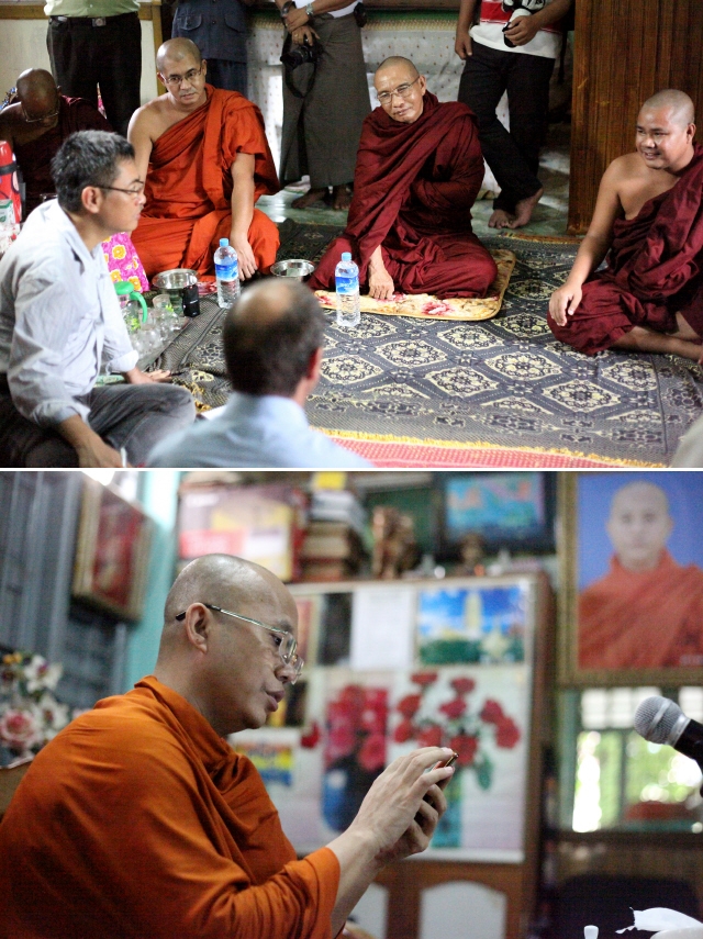 2013년 버마 아라칸주에 있는 슈웨자디 사원 승려들이 현장 조사를 나온 유엔버마인권보고관을 만나는 모습. 슈웨자디는 영국 식민지배에 저항했던 우오타마 승려가 기거하던 사원인데, 오늘날에는 불교극단주의의 상징적 구역이다(위쪽). 아래쪽은 불교극단주의 대표 단체 ‘마바타’ 리더인 우위라투 승려. 이유경 기자