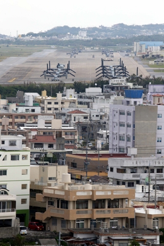 일본 오키나와 주민 거주 시설 사이로 후텐마 미군 비행장이 보인다. 미군 항공기는 초등학교 위를 저공비행하기도 한다. 한겨레 김봉규 기자