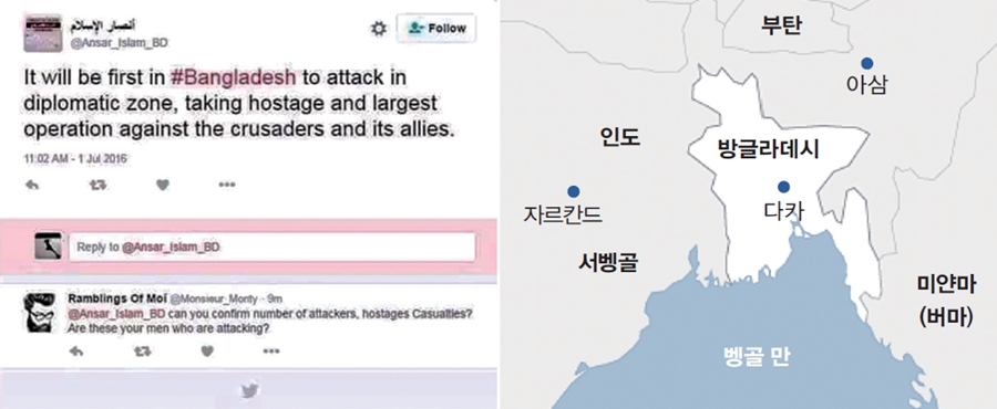 방글라데시 다카 테러를 예고하는 듯한 트윗 내용. 이 트윗 계정은 이후 사라졌다. 트윗 운영자는 ‘알카에다 인도대륙지부’의 방글라데시 전위조직인 안사룰라와 같은 조직이라는 게 전문가들의 분석이다(왼쪽). 이슬람국가(IS) 추종세력인 자마툴 훈련소는 방글라데시와 인접 지역인 인도 서벵골주, 자르칸드, 인도 동북부 아삼 지역에 있는 것으로 파악된다. 다카 테러범의 실종 동안 행선지를 밝힌다면, 이번 테러의 주체가 누구인지에 대한 많은 단서가 나올 것으로 보인다. ‘Ansar_Islam_BD’ 트위터 갈무리 (※이미지를 누르면 더 크게 보실 수 있습니다.)