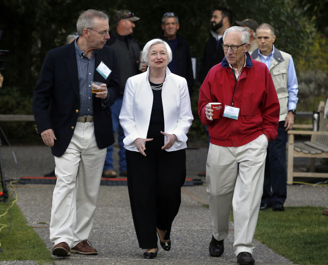 통화정책이 모든 것을 해결하던 시대는 지났다. 그래도 재닛 옐런 미국 연방준비제도 의장(가운데)의 ‘올해 안 금리 인상 가능성’을 시사하는 발언에 세계 금융시장은 촉각을 세운다. AP 연합뉴스
