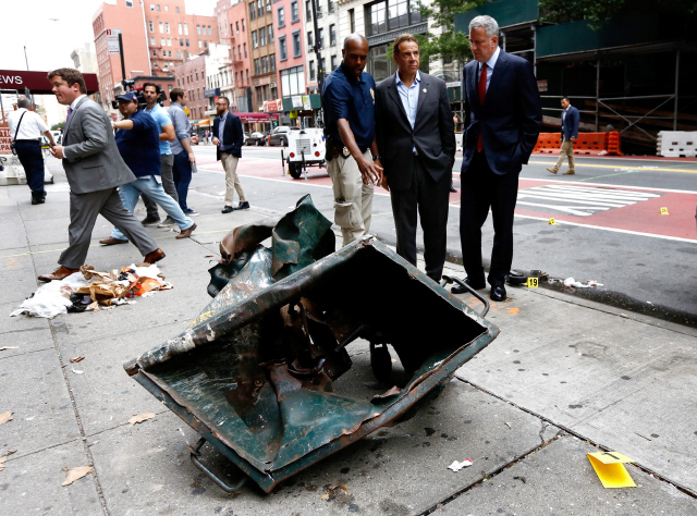빌 더블라지오 미국 뉴욕시장(맨 오른쪽)이 9월18일(현지시각) 맨해튼에서 하루 전 발생한 폭탄테러 현장을 둘러보고 있다. EPA 연합뉴스