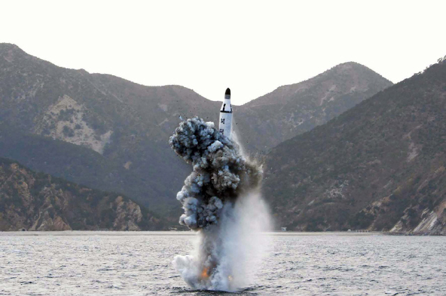 북한은 지속적으로 핵무장 능력을 선전하며 국제사회에 존재감을 부각하려 한다. 북한 <조선중앙통신>이 공개한 2016년 4월23일 잠수함발사탄도미사일(SLBM) 발사 시험 장면. AFP 연합뉴스