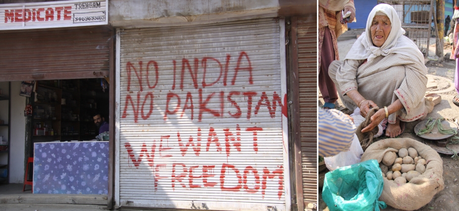 인도에 저항하는 목소리를 적극적으로 드러낸 청년 부르한 무자파르 와니의 죽음 이후 카슈미르 주민들은 길고 조용한 시위를 이어나가고 있다. 문 닫은 가게(왼쪽)와 폐업 시위로 텅 빈 거리를 지키는 노점상.