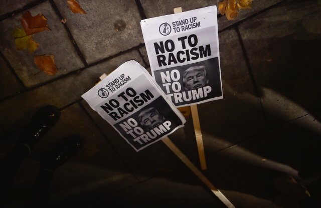 지난 11월9일(현지시각) 영국 런던 주재 미국대사관 앞에서 도널드 트럼프 미국 대통령 당선인 반대 시위가 열렸다. REUTERS