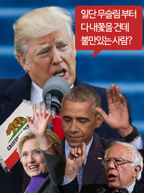 특히 캘리포니아의 움직임이 심상찮다. 미국 내 이민자들, 리버럴들의 세가 강한 이 지역에서는 반트럼프 봉화가 일찌감치 피어올랐다. 로스앤젤레스 연방법원은 반이민 행정명령이 집행되지 못하도록 잠정 금지했다. 트럼프는 행정명령에 따르지 않는 지역의 연방재정지원금을 끊겠다고 협박했다. 인터넷에서는 캘렉시트(Calexit) 해시태그가 번져나간다. 캘렉시트는 ‘캘리포니아’(California)와 ‘탈퇴’(Exit)를 합친 말로 캘리포니아의 연방 분리 독립을 가리킨다.