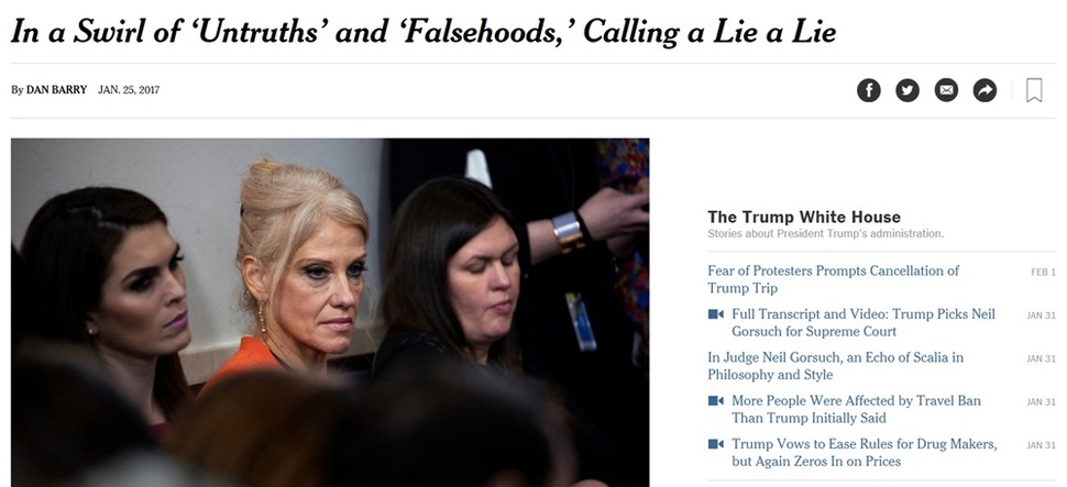 하지만 <뉴욕타임스>는 트럼프 취임 닷새 만인 1월24일 기사 제목에 대통령의 거짓말을 ‘거짓말’이라고 명기했다. ‘의원들과 만난 자리에서 선거 관련 거짓말을 되풀이한 트럼프’(