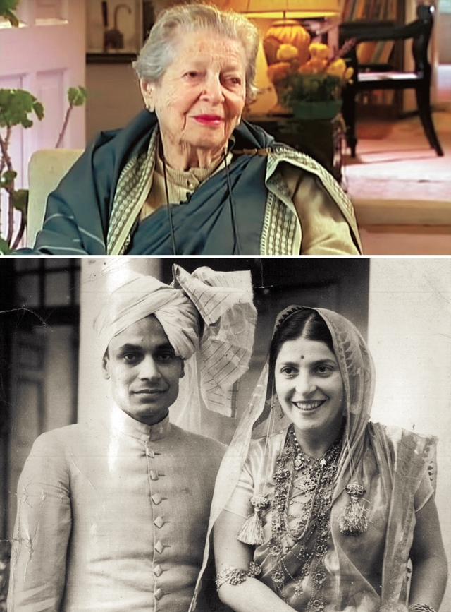 소바 네루는 인도 현대사의 격동기를 지켜본 산증인이다. 소바의 말년 모습(위)과 남편과 찍은 젊은 시절 모습. 유튜브 갈무리, www.geni.com 누리집 갈무리