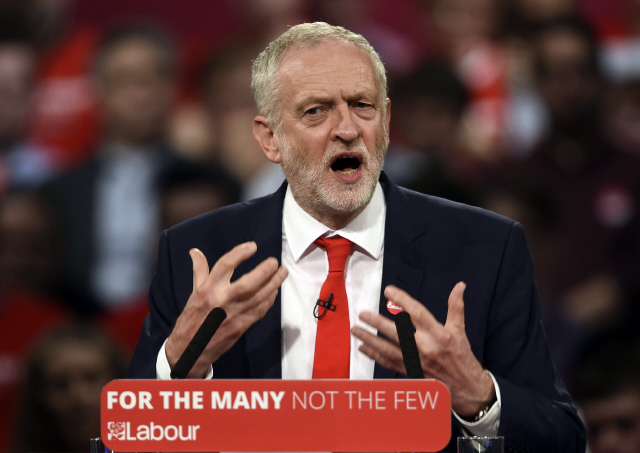 지지자들에게 연설하는 영국 노동당 당수 제러미 코빈. AP 연합뉴스