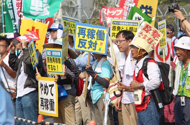 원전 재가동에 반대하는 일본 시민들이 2015년 8월 가고시마현 센다이 원전 앞에서 “재가동을 멈추라”며 항의집회를 열었다. 연합뉴스