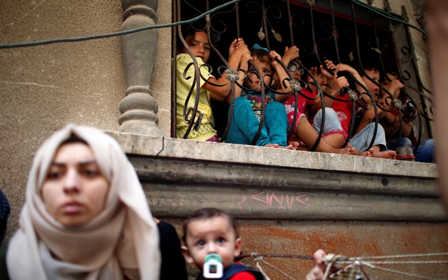 6월2일 가자지구 칸유니스에서 팔레스타인 어린이들이 전날 이스라엘군의 총에 맞아 숨진 의료 봉사자라잔 알나자르의 장례식을 지켜보고 있다. 로이터 연합뉴스