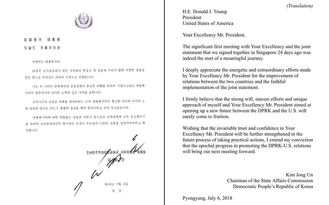 도널드 트럼프 미국 대통령이 7월13일 이른 새벽(한국시각) 트위터 계정으로 공개한 김정은 북한 국무위원장의 서한은 이렇게 시작된다. 7월6일 북-미 고위급회담 과정에서 김영철 북한 노동당 부위원장이 마이크 폼페이오 미국 국무장관에게 전달한 것으로 전해진다. 4개 문장으로 이뤄진 짤막한 서한에서 김 위원장은 트럼프 대통령을 언급할 때마다 ‘각하’라는 극존칭을 썼다.
