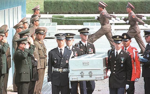1998년 10월9일 오전 한국전쟁 때 북한에서 전사한 미군 유해 5구를 판문점에서 넘겨받은 유엔사 장병들이 운구하고 있다. 이정우 선임기자