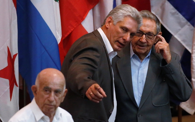 ‘쿠바 혁명, 어디로 가야 하는가?’ 미겔 디아스카넬 신임 쿠바 국가평의회 의장(가운데)이 7월17일 아바나에서 열린 상파울루 포럼 폐막식장에서 전임자인 라울 카스트로 공산당 제1서기(오른쪽)와 이야기하고 있다. REUTERS 연합뉴스