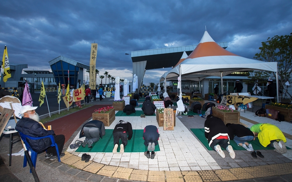 국제관함식 해상 사열이 열린 10월11일 오전 제주 서귀포 강정마을 지킴이들이 해군기지 정문 앞에서 평화의 마음을 다지는 생명평화 100배를 하고 있다. 정택용 사진가 제공