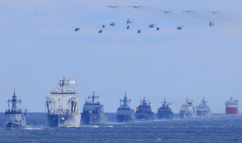 ‘이것이 평화인가?’ 2018 대한민국 해군 국제관함식 이틀째인 10월11일 오후, 제주 서귀포시 강정동 해군기지 앞바다에서 군함과 헬리콥터가 위용을 뽐내고 있다. 연합뉴스